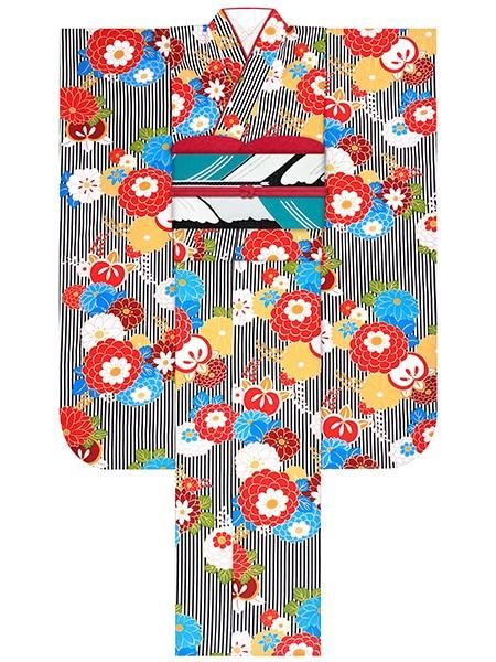 振袖レンタルセット 八咫烏×縞花丸(片身替り/オフ)/帯 縞(黒)