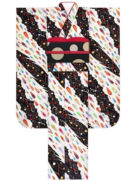 振袖レンタルセット ピーコック(黒)/帯 ドット(赤)