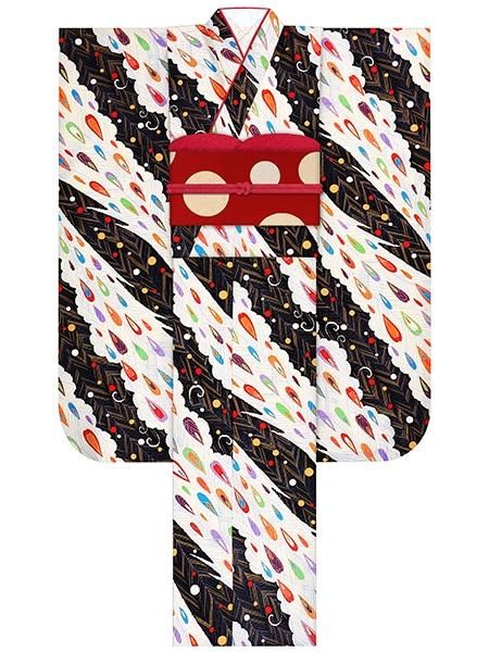 正絹振袖レンタルセット 軍鶏牡丹(オフ)/帯 ドット(赤)