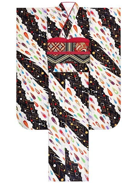 振袖レンタルセット ウロコ(片身替り/黒)/帯 七宝(白金)