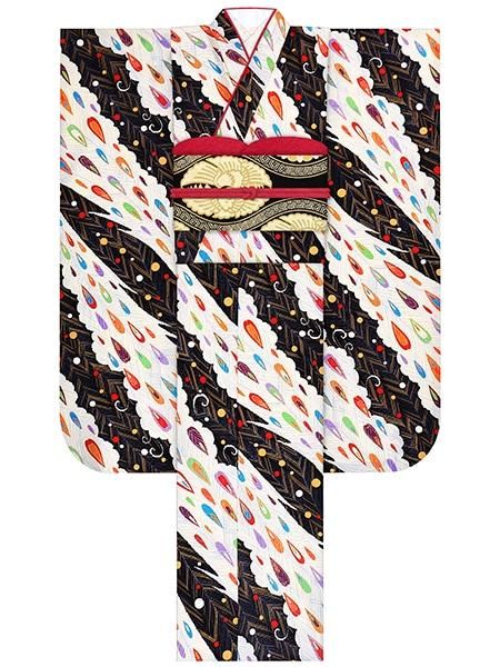 振袖レンタルセット フラッグ菊(黒)/帯 矢羽根(赤)