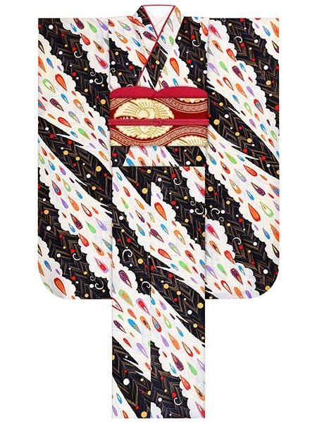 振袖レンタルセット 八咫烏×縞花丸(片身替り/オフ)/帯 矢羽根(ターコイズ)
