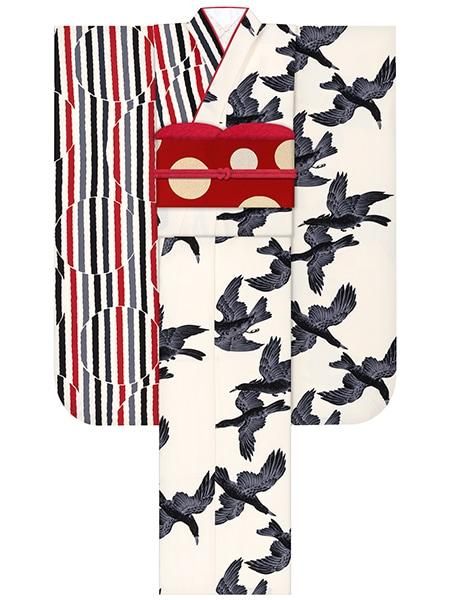 振袖レンタルセット 八咫烏×縞花丸(片身替り/オフ)/帯 七宝(ターコイズ)
