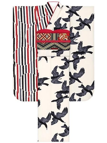 振袖レンタルセット シルエット鶴(片身替り/白黒)/帯 縞(オフ)