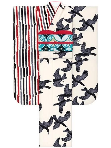 振袖レンタルセット 縞に万寿菊(黒)/帯 おしどり(黒)