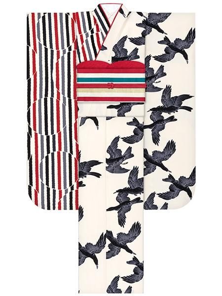 振袖レンタルセット シルエット鶴(片身替り/白黒)/帯 縞(黒)