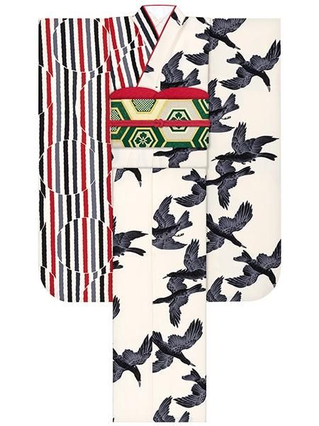 振袖レンタルセット 縞に万寿菊(黒)/帯 ドット(オフ)