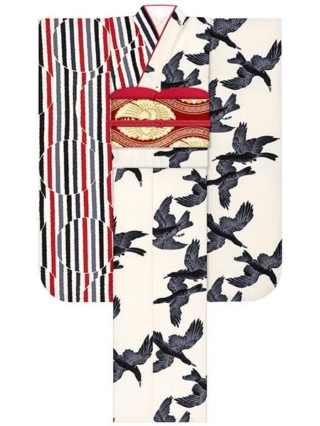 振袖レンタルセット 八咫烏×縞花丸(片身替り/オフ)/帯 おしどり(赤)