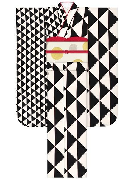 振袖レンタルセット 八咫烏×縞花丸(片身替り/オフ)/帯 亀甲(黒)