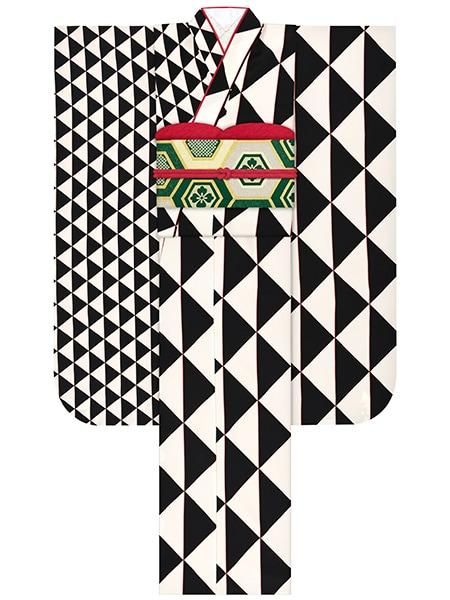 振袖レンタルセット ウロコ(片身替り/黒)/帯 亀甲(オフ)