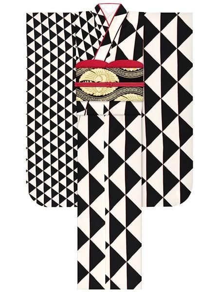 振袖レンタルセット シルエット鶴(片身替り/白黒)/帯 矢羽根(赤)