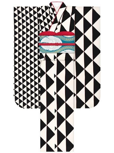 振袖レンタルセット 八咫烏×縞花丸(片身替り/オフ)/帯 おしどり(ターコイズ)
