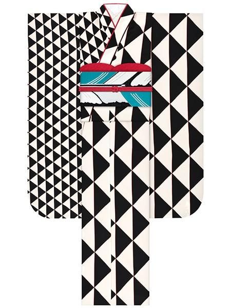 振袖レンタルセット 八咫烏×縞花丸(片身替り/オフ)/帯 縞(黒)