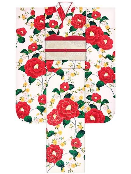 振袖レンタルセット 疋田椿(赤)/帯 縞(オフ)