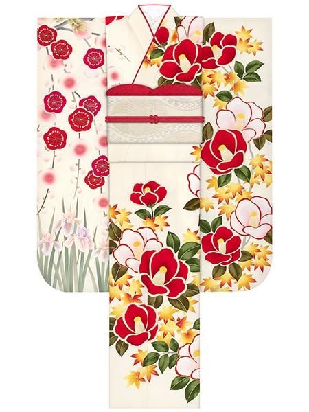 振袖レンタルセット レトロ椿(アイボリー)/帯 七宝(白金)