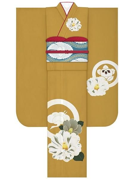 振袖レンタルセット つばき家紋(カラシ)/帯 おしどり(ターコイズ)
