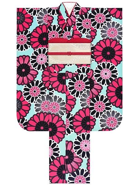 正絹振袖レンタルセット 菊と桜(くすみピンク)/帯 七宝(ターコイズ)