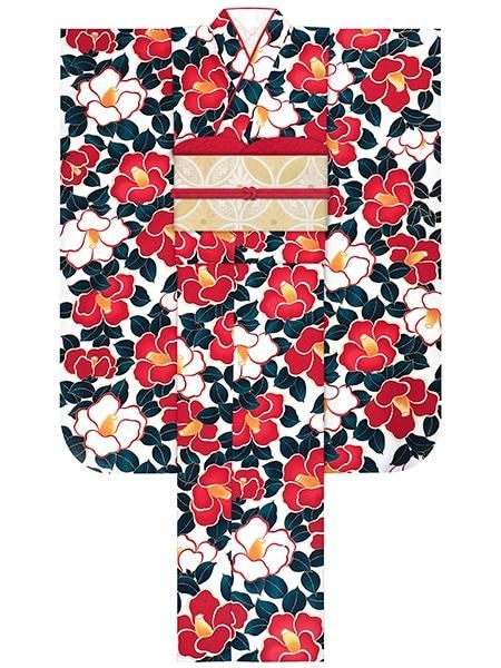 振袖レンタルセット つばき家紋(オフ)/帯 花菱亀甲(緑)