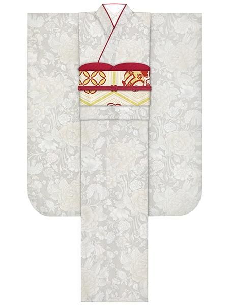 F5710 オフ色×軍鶏牡丹柄の正絹振袖単品