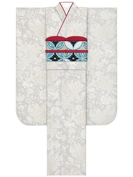 正絹振袖レンタルセット オールドローズ(グレー)/帯 おしどり(赤)
