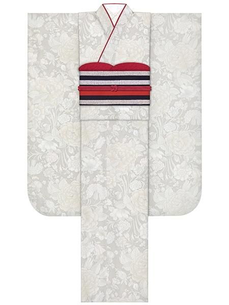 振袖レンタルセット 牡丹と鉄線(アイボリー)/帯 縞(黒)