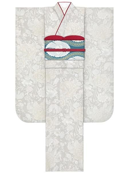 振袖レンタルセット つばき刺繍(グレー)/帯 七宝(ピンク)