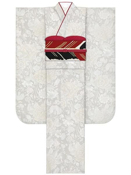 振袖レンタルセット レトロ椿(アイボリー)/帯 縞(オフ)