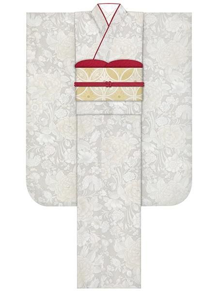 振袖レンタルセット 牡丹と鉄線(アイボリー)/帯 七宝(白金)