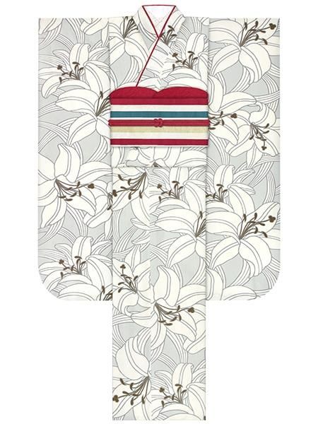 振袖レンタルセット 江戸牡丹(モノトーン)/帯 ドット(オフ)