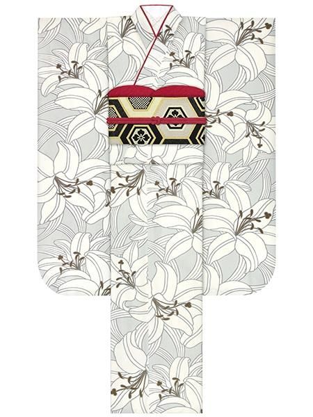 振袖レンタルセット 江戸牡丹(モノトーン)/帯 亀甲(黒)