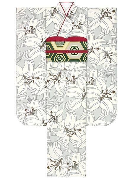 振袖レンタルセット 百合(グレー)/帯 花菱亀甲(緑)
