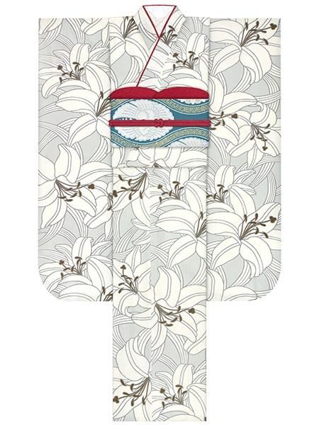 振袖レンタルセット 江戸牡丹(モノトーン)/帯 縞(オフ)