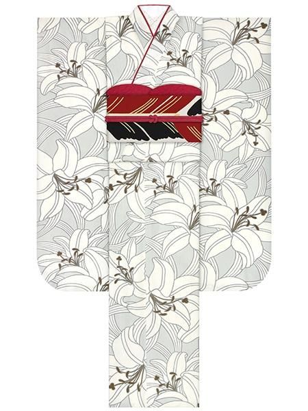 振袖レンタルセット 疋田椿(赤)/帯 縞(白金)