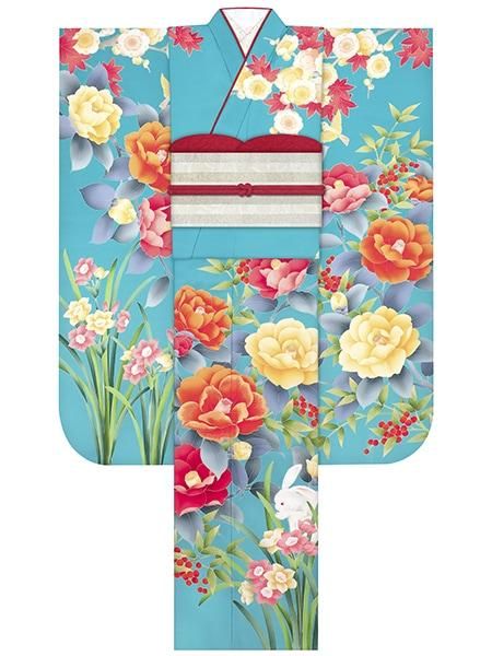 振袖レンタルセット かくれんぼ兎(ターコイズ)/帯 縞(白金)