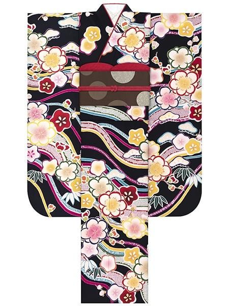 振袖レンタルセット 椿(黒)/帯 縞(白金)