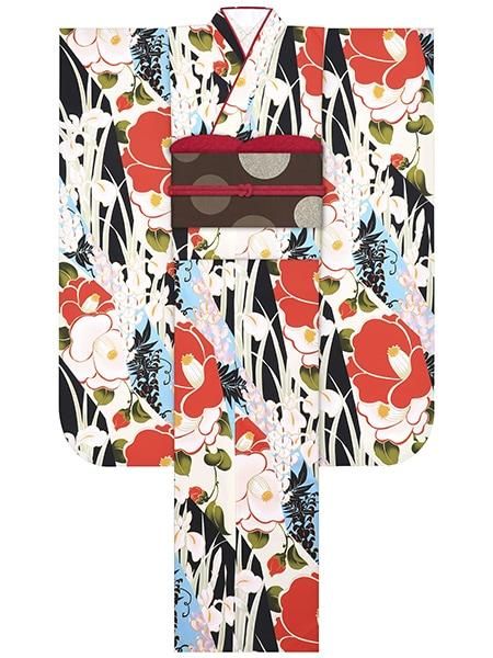 振袖レンタルセット 大梅に椿(赤)/帯 ドット(ブラウン)