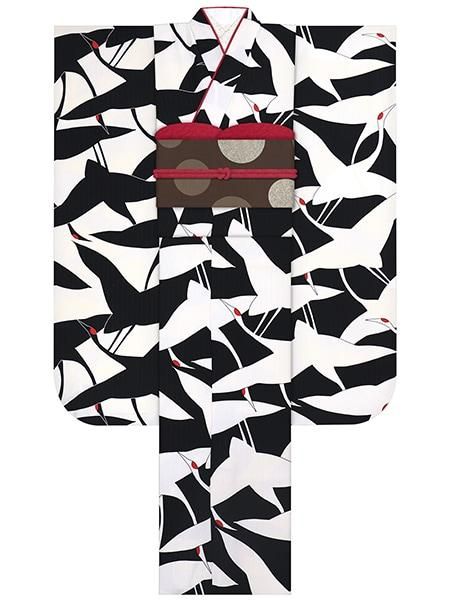 振袖レンタルセット シルエット鶴(片身替り/白黒)/帯 ドット(ブラウン)