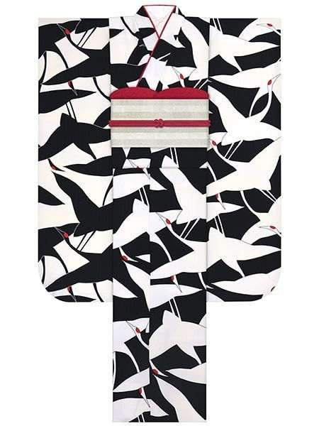 振袖レンタルセット シルエット鶴(片身替り/白黒)/帯 おしどり(ターコイズ)