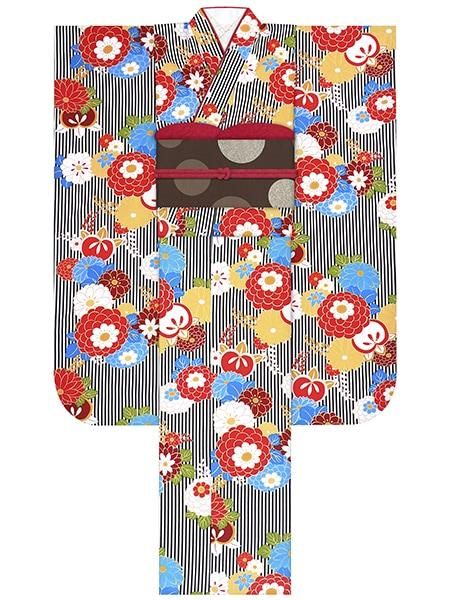 振袖レンタルセット 縞に万寿菊(黒)/帯 ドット(ブラウン)