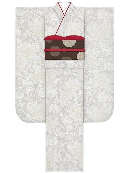 振袖レンタルセット 牡丹と鉄線(アイボリー)/帯 ドット(ブラウン)