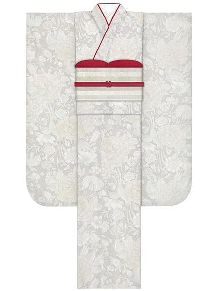 振袖レンタルセット 牡丹と鉄線(アイボリー)/帯 縞(白金)