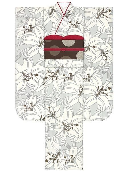 正絹振袖レンタルセット オールドローズ(グレー)/帯 亀甲(赤)