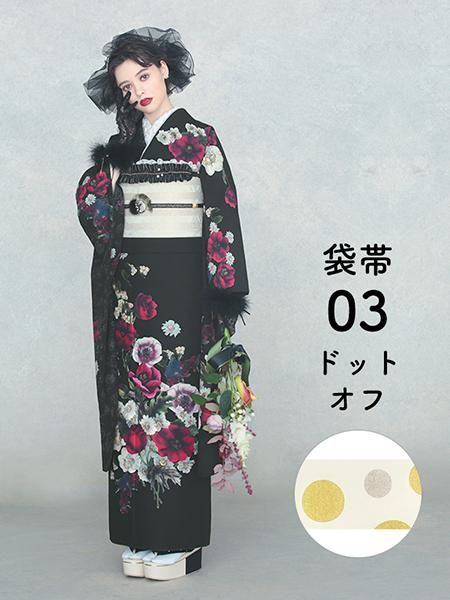 振袖レンタルセット フラッグ菊(黒)/帯 花菱亀甲(白金)