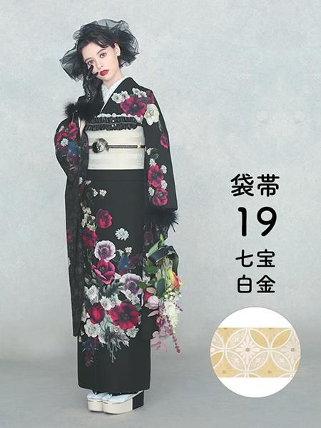正絹振袖レンタルセット バラ(黒)/帯 花菱亀甲(黒)