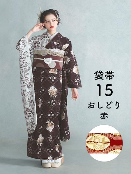 正絹振袖レンタルセット 軍鶏牡丹(オフ)/帯 ドット(ブラウン)