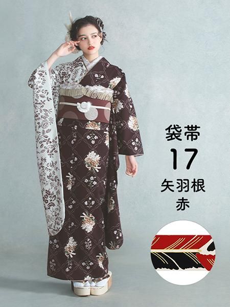 正絹振袖レンタルセット 祝い菊(ボルドー)/帯 ドット(ブラウン)