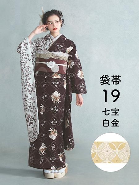 振袖レンタルセット 更紗×すみれブーケ(片身替り/ブラウン)/帯 七宝(白金)