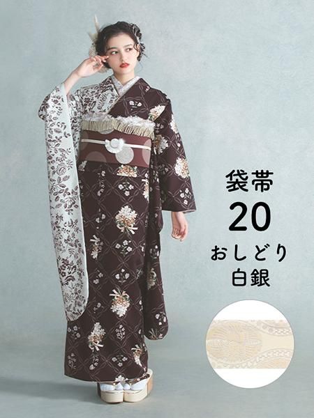 振袖レンタルセット フラッグ菊(黒)/帯 おしどり(白銀)