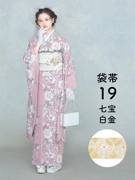 振袖レンタルセット つばき刺繍(グレー)/帯 七宝(ピンク)
