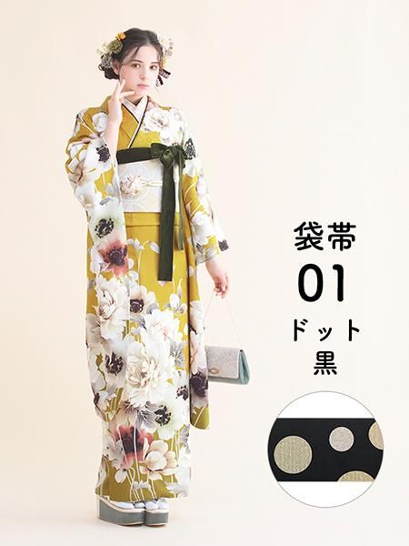 正絹振袖レンタルセット 花影(シャンパンゴールド)/帯 ドット(赤)